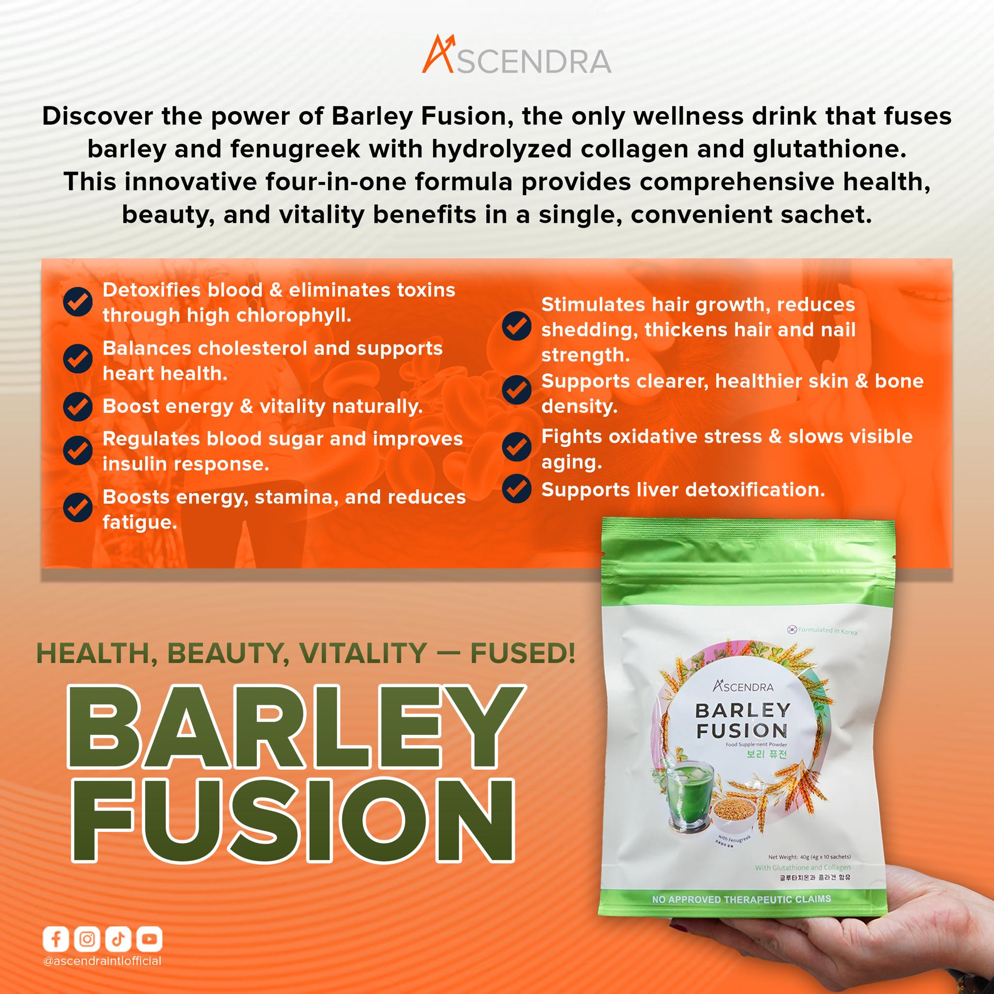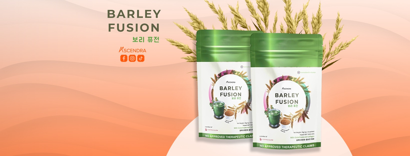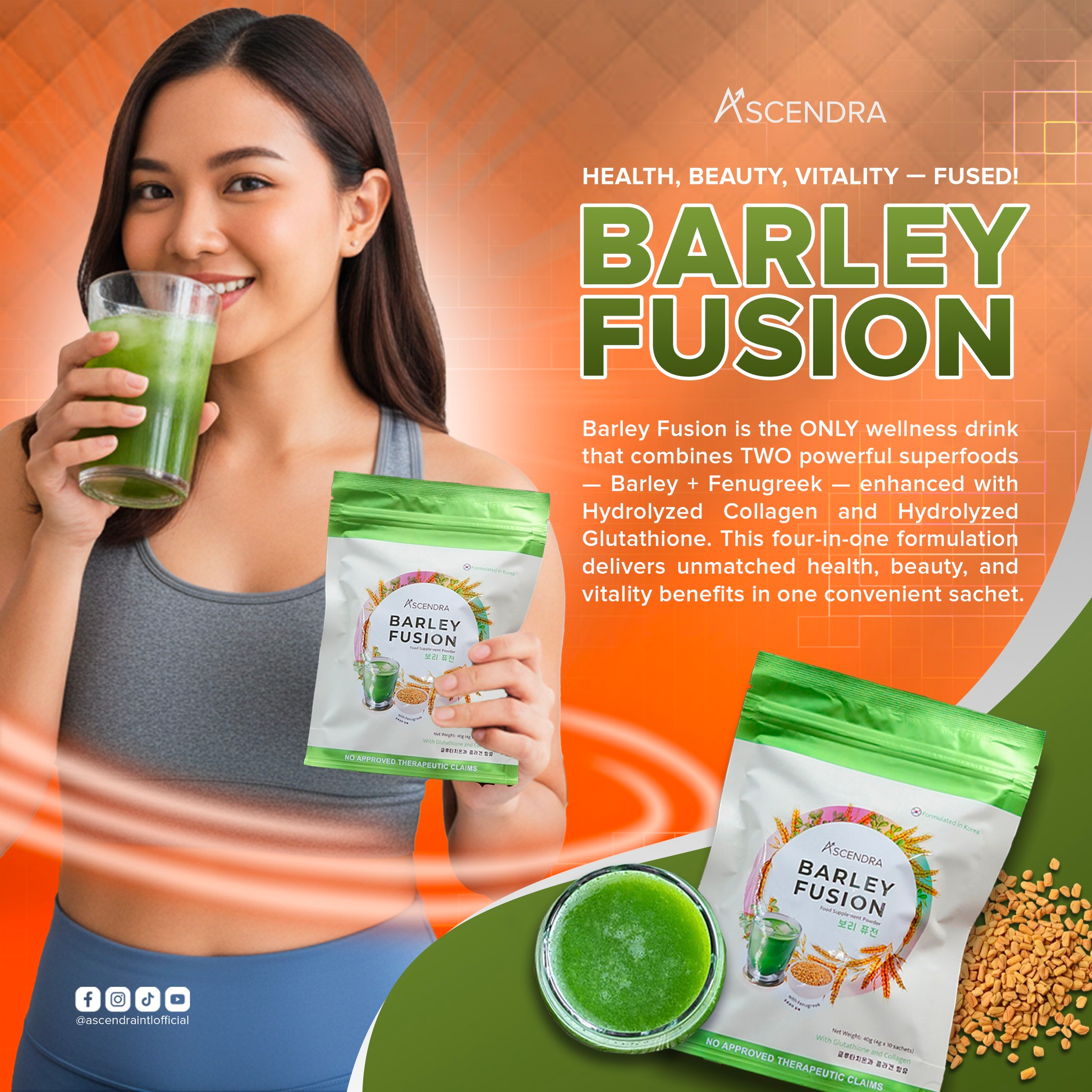 Barley Fusion is a sachet-style drink supplement formulated (reportedly in Korea) with a mix of barley and other actives designed to give both wellness and beauty benefits.